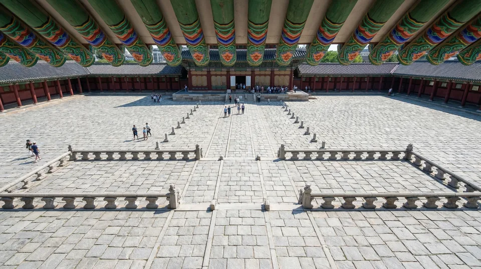 Crowd management matters in Gyeongbokgung because the most recognizable spaces are also the easiest for visitors to pile into. The main mistake is waiting too long at the exact center while more people keep entering the frame. You usually get a stronger result by stepping half a lane off the center, letting the columns repeat behind the subject, and shooting during brief gaps rather than demanding an empty court that never comes. The palace still reads clearly even when the frame is not perfectly symmetrical.