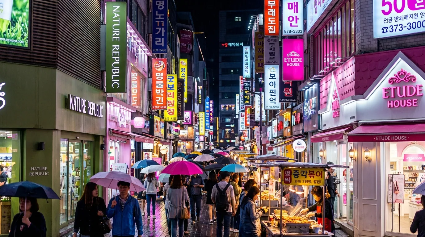 Myeongdong's light is tied to active use. People are shopping, eating, moving, and comparing things at the same time, so the scene feels functional as well as bright.